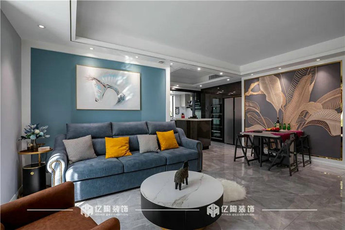 客厅以高级大气的灰调为主,一抹柔和的灰蓝点缀,白色和金属镶边,使空间在和谐统一的基础上更具视觉层次感,奠定了现代简约轻奢的基调。