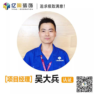 项目经理吴大兵,06年进入亿陶装饰至今,有着丰富扎实的施工经验和客户的好评口碑。连续多年获得亿陶装饰优秀项目经理奖,做事踏实靠谱、心细负责。