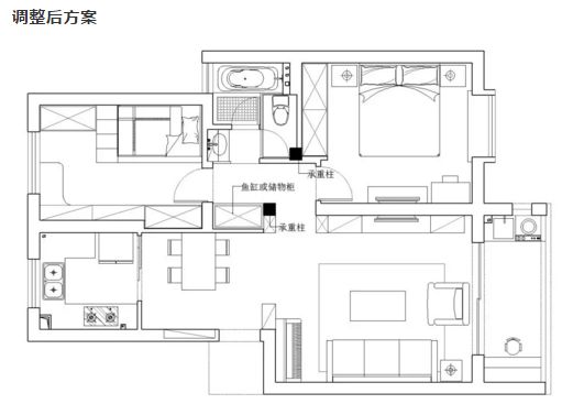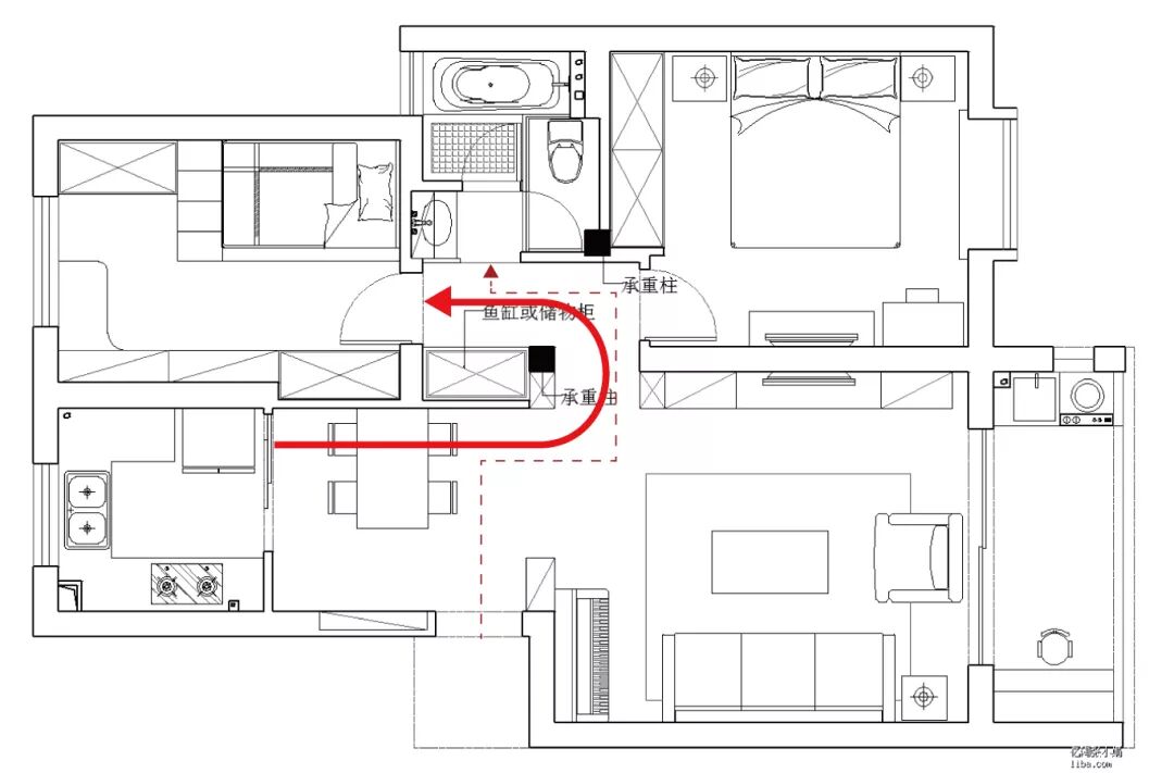 当然,有趣的还是标红5处,对照调整前后图纸,可见这一因承重墙而改变的设计,却留出了鱼缸的位置,不仅改善了卫生间正对大门的风水禁忌,还让餐厅也变大了。